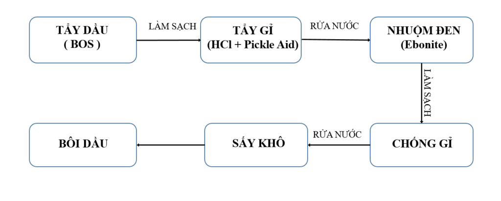 Quy trình tiêu chuẩn gồm có: Tẩy Dầu – Tẩy Gỉ – Nhuộm Đen – Chống Gỉ – Sấy Khô – Bôi Dầu.